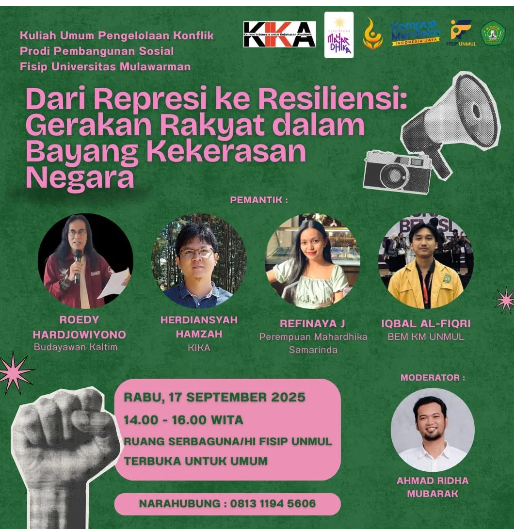 Represi negara tidak selalu berakhir pada kepasrahan. Justru, dari trauma kolektif, lahir daya tahan baru yang menjaga gerakan rakyat tetap menyala. Gagasan itu mengemuka dalam kuliah umum bertajuk “Dari Represi ke Resiliensi: Gerakan Rakyat dalam Bayang Kekerasan Negara” di Fakultas Ilmu Sosial dan Ilmu Politik (FISIP) Universitas Mulawarman, pada Rabu (17/9/2025).